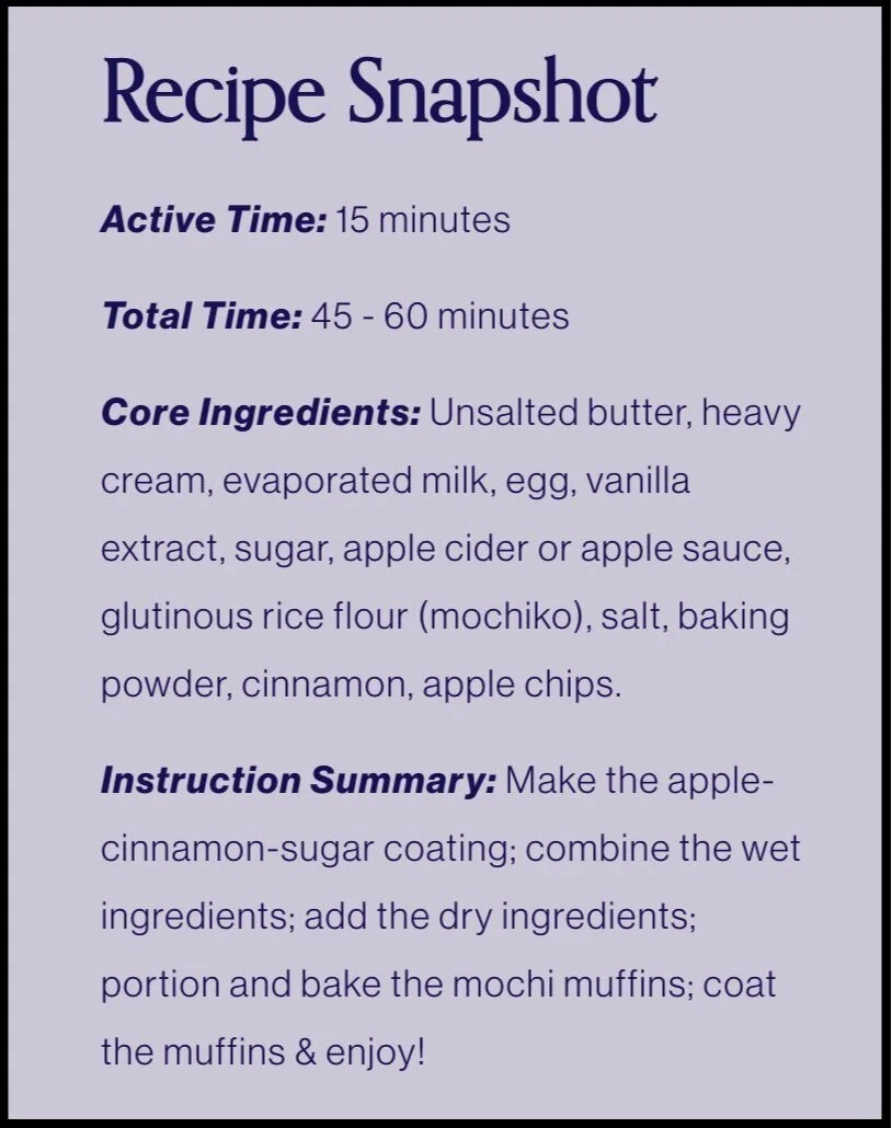 Do take note that these muffins are NOT the consistency you would expect from a muffin from your standard local bakery. They don’t use any wheat flour, just glutinous rice flour, resulting in soft, squishy, chewy apple-flavored “muffins”. They’re also entirely gluten free which makes them a lovely option for holiday parties or gifts for gluten-intolerant friends! (Glutinous rice flour is 100% gluten free)