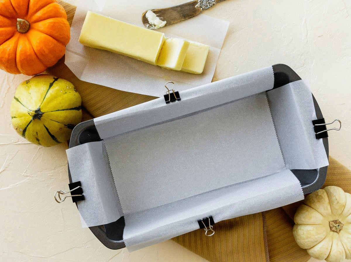 Line an 8x4 loaf pan with two overlapping strips of parchment paper. Each paper should be long enough to cover the bottom and sides of the pan, with some overhang on each side (see process photos above for more detail).